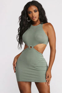 Step up in a sleeveless ribbed mini dress with sexy cutout details this season. The curve-hugging ribbed dress features a flattering crew neck that leads to a chic O-Ring at the mid-drift accented with waist cut outs for a subtle hint of skin. The back reveals a matching lower back cut out to impress from all angles. The ribbed knit embraces curves while offering a moderate stretch to easily move. Complete this date-night ready look with daring hoops and strappy stilettos.