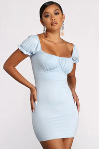 Create a sweet moment in this alluring mini dress for your next date night! The dress features a square neckline, bold short puff sleeves, and a mini-length silhouette. The dress is composed of a crepe fabric that offers a form-hugging fit with a moderate stretch. Complete the look with clear mules.