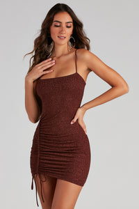 Shine on in this glitzy dress that brings the dazzle. The mini dress features a sleeveless square neckline, ruched side seams for a customized fit, and is composed of a glitter knit fabric. Complete your look with rhinestone earrings.