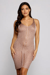 You'll look like a total gorgeous goddess in this sultry metallic mini dress! It features a sleeveless V-neckline, thin shoulder straps, a backless design, a mini-length, curve-hugging silhouette, and a metallic sweater knit fabric with center seam detailing down the front. Style this dress with gold hoop earrings and clear heels for a sexy summer look.