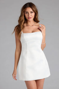 Amalia Bow A-Line Satin Short Dress Amalia Bow A-Line Satin Short DressSpecial Occasion The gorgeous Amalia satin short dress is a real head-turner with a simply chic A-line silhouette and a statement bow along the back! Fit & Features - Satin fabric, sewn-in woven lining