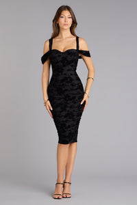 Chic Affair Flocked Floral Velvet Cold-Shoulder Midi Dress Chic Affair Flocked Floral Velvet Cold-Shoulder Midi DressRomantic, sultry, and made to linger in the spotlight. This floral velvet midi dress hugs every curve while the cold-shoulder detail keeps it flirty and unexpected. Fit & Features - Sheer mesh fabric with knit lining, high stretch