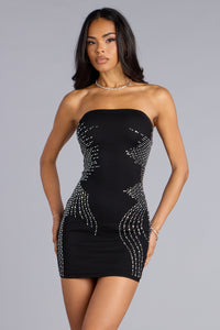 Shine Curve Tube Mini Dress Shine Curve Tube Mini DressA little sparkle goes a long way. This tube bodycon mini is trimmed with rhinestones that highlight every curve, serving the perfect mix of sleek and sultry. Pair with heels for a night out. Fit & Features - Mesh-lined stretch fabric