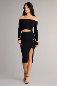 Fireside Flirt Off-The-Shoulder Midi Dress Fireside Flirt Off-The-Shoulder Midi DressMinimal effort, maximum slay—this knit midi dress is the definition of chic. With its off-shoulder neckline, peekaboo cutout, and side slit, it’s your new go-to for dinner dates or rooftop wine bars. Fit & Features - Stretch rib knit fabric