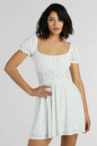 The sweet eyelet design and adorable details give this puff sleeve skater dress a charming appeal! Made with an airy sheer eyelet knit fabric with a partial knit lining, this short dress is perfect for your spring and summer weekend outings. It features a square neckline with chic ruching at the bust, sheer short puff sleeves with a dainty ruffled trim, a sheer corset-style bodice to create a cinched look, and a fit-and-flare skater silhouette for a flirty vibe. Complete your outfit with hoop earrings!