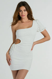 Dress to impress in this sweet one-shoulder cutout eyelet lace dress guaranteed to turn heads as the lovely bride-to-be or graduate! Made from eyelet lace fabric, this bodycon dress will hug your curves in all the right places. This stunning mini-length dress features a trendy one-shoulder neckline, a flirty puff sleeve, and a sultry side drawstring cutout so you can customize the look. Style this dress with sandals and a tote bag.