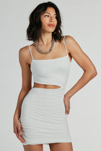 This trendy ruched knit mini dress will have your everyday 'fits always on point! Made with a stretchy ribbed knit fabric for comfortable wear, this mini-length dress features a sleeveless scoop neckline with thin tank shoulder straps and ruched detailing to accentuate your curves on the bodycon silhouette. Style with a boyfriend blazer and heels for happy hour!