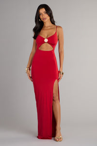 Bring the fire—this maxi is all drama with its daring cutout, luxe gold detail, and thigh-high slit. Sleek, sultry, and made for the nights when subtle just isn’t in your vocabulary.