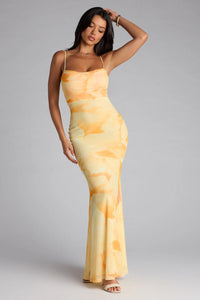 Bring the drama to your dressy affair in this lined mesh maxi dress accented with an abstract floral print for a gorgeous vibe. The dress features a sleeveless cowl neckline, tie-back halter straps leading to an alluring open back, and a maxi-length mermaid silhouette to show off your curves.