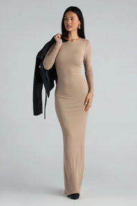 - Maxi-length bodycon silhouette