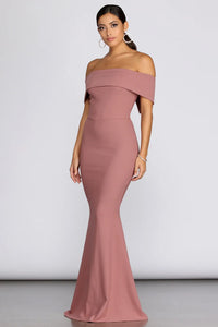 Keep it radiant in the Rochelle dress! Make a sensational entrance at your next special event in this formal crepe dress featuring a stunning off-the-shoulder neckline with a sweetheart bust that cascades off the shoulders, and a built-in bust for support. The vertical seams on the bodice create a streamlined look on the flared mermaid silhouette that highlights curves to create an hourglass effect. Complete your formal outfit with rhinestone heels and a sleek satin clutch.