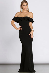 Lead the room in timelessly gorgeous ruffles in our Lindsay dress! She features a sleeveless bodice, an off the shoulder neckline and an asymmetrical shallow V neckline bust with a double ruffle detail. Her slim fit bodice leads to an elongating mermaid skirt that highlights curves. She is composed of a black hued crepe fabric that offers a moderate stretch. Includes a back zipper closure.