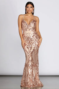 Radiate and glow from the inside out in our charming Julieanne dress! She features a sleeveless bodice, a plunging V neckline with built in no slip strip and a double row of spaghetti straps that leads to a cross back design. Her slim fit bodice leads to a floor length silhouette with a flared hemline. The all over lined mesh fabric is adorned with glitzy sequins set in a scroll print pattern. Dress offers a form hugging fit with minimal stretch. Includes a back zipper closure.