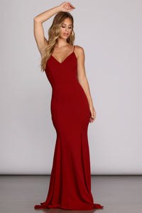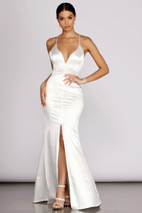 Set off sparks in the Raelynn dress that brings the sultriness for your next evening out. The Raelynn formal satin dress features a plunging V-neckline that styles well with your favorite statement necklaces and a bold open back with adjustable cross straps. The fitted bodice leads to a curve-hugging mermaid silhouette that is accented with a sexy front, thigh-high slit. Complete your look with sparkling rhinestone earrings and a matching clutch to bring glamour to your formal evening outfit.