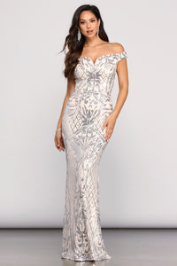 Dazzle and shine in sequins as you make a gleaming entrance in our Janessa  dress! She features an off the shoulder neckline with shoulder strap accents, a wired sweetheart bust, padded cups and princess seams. Her slim fit bodice leads to an elongating floor length silhouette. She is composed of a lined mesh fabric that is adorned with sparkling sequins set in a baroque inspired print. Dress offers a relaxed fit with minimal stretch. Includes a back zipper closure with fish hook clasp.