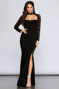 Impress in lace as you have all eyes on you from the moment you enter the room in our Danielle dress! She features a mock neck with a double button closure, a large front keyhole leading to a sweetheart bust, padded cups and princess seams. Her back features a matching keyhole to show off a little hint of skin. Her slim fit bodice leads to a floor length skirt accent with a high side slit and a lace contrast detail. She is composed of a crepe fabric that offers a form hugging fit with moderate stretch. Includes back zipper closure.