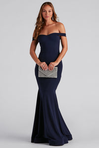 Stun in a formal mermaid dress that radiates elegance and grace. Captivate with a sleek, timeless style for your next special event in a dress that brings glamour. The Maddison formal dress features an off-the-shoulder neckline with a fold-over accent and vertical princess seams at the bust that provides structure. The relaxed fit bodice leads to a curve-hugging mermaid silhouette that flatters curves by creating an hourglass illusion. Complete your elegant formal outfit with a rhinestone hair clip to create a gorgeous updo and a sleek envelope clutch.