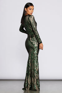 Glam it up in sophisticated sequins as you own the night in our emerald green Alexandria dress! She features a high round neckline, fitted long sleeves and an all over emerald green hued sequin detailing set in a chic scroll print pattern. Alexandria is composed of a sheer mesh fabric lined with a lining to create a flattering two-tone effect. Dress offers a relaxed fit with minimal stretch and includes a back zipper closure.