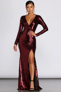 Razzle and dazzle as you dive into glam sequins! Our Braelynn dress features a plunging V neckline with light pleating detail and fitted long sleeves. Her relaxed fit bodice leads to a curve hugging mermaid silhouette accented with a high side slit to bring the drama! She is composed of a lined mesh fabric complemented with burgundy hued sequins for non stop shine! Dress offers a moderate stretch and includes a back zipper closure.