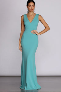 Stand out tonight in our Miriam dress! She features a sleeveless body with a V neckline, a plunging V back with a bar detail, a fitted bodice and a trumpet silhouette. She is composed of a crepe knit that offers a moderate stretch. Includes back zipper