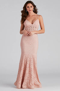 Romance is in the air! The Normani Formal Lace Corset Mermaid Long dress brings flirty love vibes to every party. She features a classic sleeveless, v-neckline with adjustable spaghetti straps, a built-in padded bust, and a sheer lace corset-style bodice that leads to her form-fitting, mermaid floor-length silhouette. The formal dress is composed of a delicate lace sparkly lined fabric with a minimal stretch. Finish the look in classy heels and a choker.
