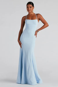 Lace up in a formal dress that brings the elegance to your event! Meadow features a sleeveless square neckline, flexible boning for structure, spaghetti straps, a lace-up back design, and a mermaid silhouette with a wide banded hem. The dress is composed of a lined crepe fabric that offers a form hugging fit with a moderate stretch. Complete look with rhinestone heels and a clutch.