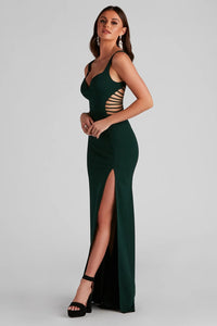 Create a chic eye-catching formal look in the stunning Clarissa mermaid dress. She features a sleeveless sweetheart neckline with a built-in padded bust, thin shoulder straps, cutout caged detailing at the sides leading to the back, a lower back cutout, and a floor-length, fitted, mermaid silhouette with a thigh-high side slit to showcase some leg. The crepe fabric offers a moderate stretch. Complete the look with rhinestone duster earrings.