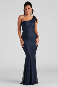 Get in a glitzy and glamorous mood in the Alaia glitter mesh mermaid dress. She features a sleeveless one-shoulder neckline with a chic bow accent, a fitted high waist seam, and a floor-length, curve-hugging, mermaid silhouette. The sheer glitter mesh fabric includes a full knit lining. Complete the look with rhinestone statement earrings.