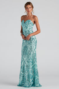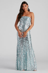 Stun with the prettiest sequins in the Elliana mermaid dress! She features a strapless straight across neckline, a padded bust, a high waist seam, and a floor-length, fitted, mermaid silhouette. The sheer mesh fabric includes a full knit lining and all-over sequin embroidery in a gorgeous swirl design. Complete the look with an embellished clutch.