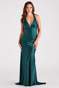 Ready for the red carpet or walk down the aisle as a bridesmaid, the Candace formal satin dress is sure to leave a breathtaking impression! She features a sleeveless plunge halter V-neckline with hook-eye closures, a strappy low-back design, a padded bust, and a figure-flattering mermaid silhouette with a floor-sweeping hem. The formal dress is composed of luxurious woven satin fabric with lining and no stretch. Complete the look in rhinestone hoop earrings and a clutch.