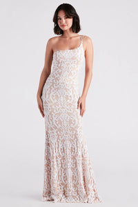 Capture all the attention at your next black-tie affair in the gorgeous Leighton formal sequin mermaid dress! She features an asymmetric one-shoulder neckline, dual adjustable spaghetti straps that continue to the back, a fitted bodice, a hip-hugging fit, and a floor-sweeping mermaid silhouette. The lined mesh fabric features a stunning sequin embroidered scroll pattern for an elegant touch. Complete the look with a rhinestone clutch.