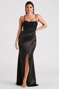 The Lucille formal satin dress will have you looking and feeling radiant and luxe! The dress captivates with a lace-up back, mermaid silhouette, and high front slit for effortless allure.