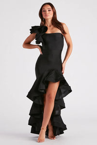 Timeless with an eye-catching twist, the Audrey long formal dress is ready to make your acquaintance for banquets, ceremonies, and black-tie events. She features a striking sleeveless one-shoulder neckline, a bonded ruffled design for a structured look, a flattering mermaid silhouette, and a bonded ruffled long-length hem. The formal dress is composed of a sleek scuba knit fabric with plenty of stretch. Complete the look with a clutch and stiletto pumps.