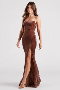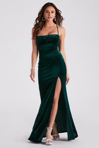 Luxurious velvet on the Carla formal dress creates an elegant holiday-ready party look! She features a sleeveless square neck, spaghetti straps that lace up along the back, a ruched bust, and a form-hugging, mermaid silhouette with a high-cut slit and floor-length hem. The formal dress is composed of a soft-lined velvet knit fabric with a moderate stretch. Style with earrings and a clutch to complete the look!