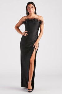 Flaunt your diva allure in the Zuri formal sequin dress to make a grand debut at school dances, sweet sixteens, or banquets! She features a strapless neckline with a statement feather bust, non-slip grip lining, and a flattering mermaid silhouette, high side slit, and floor-length hem. The formal dress is composed of a light-catching sequin embellished fabric with a stretchy knit lining. Complete the look in this long sequin dress with platform stiletto heels.