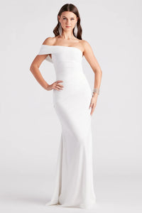 The Jackelyn formal crepe dress accentuates your sophistication and chic style for your grand walk down the aisle as a beautiful bride! She features an off-the-shoulder folded neckline, and a pleated side seam that creates the wrap-style bodice leading to her figure-flattering mermaid silhouette with a lovely floor-length hem. The formal dress is composed of a lightweight crepe fabric with a stretchy knit lining. Complete the look for your big day with statement heels and a choker necklace.