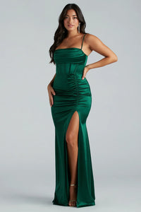 Put your curves on display in the stunning Kacey formal satin dress that makes a gorgeous option for bridesmaids, wedding guests, or school dances! She features a sleeveless square neckline, adjustable spaghetti straps, a corset bodice with flexible boning for a structured look, a padded bust, and a hip pleated side seam that creates the asymmetrical wrap mermaid skirt with a sultry slit along her floor-length hem. The formal dress is composed of silky satin-lined fabric with moderate stretch. Complete the look with earrings and a clutch.
