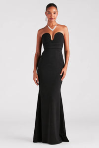 Laura Formal Glitter Mermaid Long Dress Laura Formal Glitter Mermaid Long DressSpecial Occasion Dazzling glitter sparkles from every angle on the Laura formal long dress to captivate the room at galas and black tie events! She features a strapless U-wired shape sweetheart neckline, lovely pleating under the bust, and a hip-hugging, long mermaid silhouette that flaunts your gorgeous figure. The formal maxi dress is composed of a glitter crepe fabric with a sewn-in knit bust lining. Complete the look with rhinestone teardrop earrings and heels. Fit & Features - Strapless U-wired shape sweetheart neckline