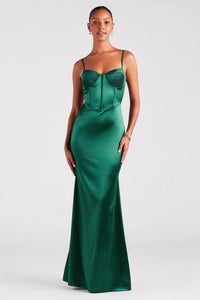 Jaycee Formal Satin Corset Mermaid Dress Jaycee Formal Satin Corset Mermaid DressSpecial Occasion With a glam silhouette, a gorgeous bodice, and silky satin fabric the Jaycee formal dress truly shines for all to admire! She features a sleeveless sweetheart neckline, adjustable spaghetti straps, a pleated and padded bust, a corset bodice that snatches your figure with flexible boning inserts, and a mermaid silhouette with a graceful floor-length hem. The formal dress is crafted from a luxe satin fabric with a subtle sheen and moderate stretch. Complete the look with fringe earrings for a banquet dinner or gala event! Fit & Features - Sleeveless sweetheart neckline, adjustable spaghetti straps