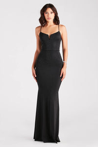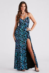Lissa Formal Sequin Lace-Up Mermaid Dress Lissa Formal Sequin Lace-Up Mermaid DressSpecial Occasion Twinkle like a star in the Lissa formal sequin dress that brilliantly shines all night! She features a sleeveless sweetheart neckline with a wired insert, a padded bust, spaghetti straps that create the lace-up back design, a high front slit, and a flattering mermaid silhouette that highlights your curves along the floor-length hem. The formal dress is crafted from a stunning sequin scroll embellished pattern on mesh fabric with a stretchy knit lining. Complete the look for a school dance, gala, or fancy soiree with a necklace and heels. Fit & Features - Sleeveless sweetheart neckline, wired insert