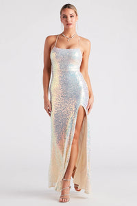 Aniyah Formal Sequin Lace-Up Dress Aniyah Formal Sequin Lace-Up DressSpecial Occasion Sparks fly when you enter the room in the Aniyah formal sequin dress that will have you shimmering from head to toe! Shine at school dances, celebrations, or a black tie event. She features a sleeveless square neck, a lightly padded bust, satin spaghetti straps that lace up in the back, a mermaid silhouette, and a skin-baring front high slit along the floor-length hem. The formal dress is composed of twinkling iridescent sequins on mesh fabric with a stretchy knit lining. Complete the look in stiletto heels. Fit & Features - Sleeveless square neck, lightly padded bust