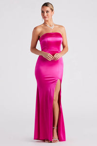 Mia Formal Satin Strapless Long Dress Mia Formal Satin Strapless Long DressSpecial Occasion All the sophistication with a hint of sultry! The Mia formal satin dress is a stunning option for bridesmaids to wedding guests and, fancy events. She features a sleek and strapless folded neckline with non-slip grip lining, a lightly padded bust, and a mermaid silhouette with a skin-flaunting high front slit along the floor-length hem. The formal long dress is composed of silky smooth satin fabric with a stretchy knit lining. Complete the look with a sleek clutch and lace-up heels. Fit & Features - Strapless folded neckline, non-slip grip lining