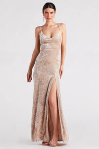 Samaria Formal Crushed Velvet Long Dress Samaria Formal Crushed Velvet Long DressSpecial Occasion Beautifully crafted from crushed velvet for a brilliant luxe look, the Samaria formal dress will have you looking flawless at school dances, weddings, and banquets! She features a sleeveless V-neckline, a padded bust, sleek bungee spaghetti straps that form the strappy back design, a mermaid silhouette, and a sultry front slit along her floor-length hem. The formal long dress is composed of a soft crushed velvet fabric with lining and moderate stretch. Finish the look with a rhinestone bracelet and stiletto heels. Fit & Features - Sleeveless V-neckline, padded bust