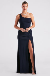 Bettie Formal Crepe One Shoulder Dress Bettie Formal Crepe One Shoulder DressSpecial Occasion Dial up your sophistication and sultriness in the Bettie formal dress - a stunning option for bridesmaids, banquets, or school formals! She features a sleeveless one-shoulder neckline, a tank-style strap, and a lightly padded bust eliminating the need for a bra. Her form-hugging mermaid silhouette is designed with a front ruched seam atop a high-cut slit to show some skin along the floor-length hem. The formal dress is composed of a crepe-lined knit fabric with a moderate stretch. Complete the look in this long dress with a divine jewelry set and statement heels. Fit & Features - Sleeveless one-shoulder neckline, tank-style strap