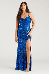 Noel Formal Sequin Velvet Lace-Up Dress Noel Formal Sequin Velvet Lace-Up DressSpecial Occasion Sparkle through the night in the luxurious Noel formal velvet dress designed with jaw-dropping iridescent sequins! Capture all the attention at prom and black-tie weddings. She features a sleeveless plunge V-neckline, padded bust, spaghetti straps that form the lace-up back design, and a mermaid silhouette with a skin-flaunting front slit along her floor-length hem. The formal dress is composed of a luxe velvet sequin-embellished fabric with a stretchy knit lining. Complete the look with strappy block heels. Fit & Features - Sleeveless plunge V-neckline, padded bust