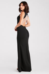 Bella Formal Crepe Rhinestone Open Back Dress Bella Formal Crepe Rhinestone Open Back DressSpecial Occasion The Bella formal crepe dress is a major head-turner! Stunning for award banquets, anniversary parties, and black tie events. She features a sleeveless high neckline, dual back button closures, a revealing open back with rhinestone fringe, a lower ruched seam, and a flattering mermaid silhouette, high front slit, and floor-length hem. The formal dress is composed of a lined crepe fabric with a moderate stretch. Complete the look with a glamorous hair clip and gloves. Fit & Features - Sleeveless high neckline, back dual button closures