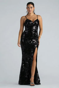 Sandy Formal Velvet Sequin Mermaid Dress Sandy Formal Velvet Sequin Mermaid DressSpecial Occasion A dazzling sequin pattern gives a dash of regal flare to the Sandy formal velvet dress! She features a V-neckline with a wire insert, adjustable spaghetti straps for a customized fit, a mermaid silhouette that flaunts your gorgeous curves, and a high front slit and floor-length hem. The formal dress is designed with a sequin-embellished pattern on soft velvet fabric to bring the sparkle to your night and has a stretchy short knit lining. Complete the look for a red carpet, gala, or formal celebration with a bracelet and earrings. Fit & Features - Sleeveless V-neckline, wire insert