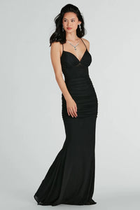 Kollyn Formal Surplice Ruched Mermaid Dress Kollyn Formal Surplice Ruched Mermaid DressSpecial Occasion Meet your look for upcoming fancy soirees or events! The Kollyn formal dress features a classy surplice V-neckline and V-cut back, adjustable spaghetti straps, a padded bust, side ruched seams that accentuate your natural curves, a flattering mermaid silhouette, and a floor-length hem. The formal dress is crafted from a smooth and stretchy knit fabric with a subtle sheen. Complete the look with an elegant necklace and earrings for some sparkle! Fit & Features - Sleeveless surplice V-neckline, V-cut back