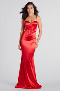 Francine Formal Satin Bustier Mermaid Dress Francine Formal Satin Bustier Mermaid DressSpecial Occasion Be exceptionally elegant in the timeless Francine formal satin long dress at black-tie soirees! Crafted from a silky satin-knit fabric, she features a sleeveless sweetheart neckline with a padded and structured bust, a bustier bodice to snatch your waist, adjustable spaghetti straps, and a curve-hugging mermaid silhouette with a floor-sweeping hem for a dramatic flair. Complete the look with rhinestone earrings. Fit & Features - Sleeveless sweetheart neckline, padded bust, structured underwire