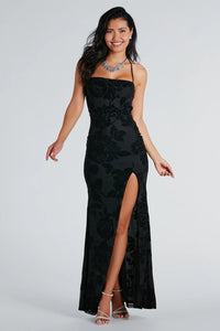 Norma Formal Velvet Floral Lace-Up Mermaid Dress Norma Formal Velvet Floral Lace-Up Mermaid DressSpecial Occasion Searching for the perfect party dress? The Normal formal long dress is sure to stand out on any occasion! She features a V-neckline with spaghetti straps that formal the strappy lace-up open-back design, a flattering mermaid silhouette, and a high front slit to show some leg along the floor-length hem. The formal maxi dress is crafted with a flocked velvet floral pattern on mesh fabric for a unique yet sophisticated style. Complete the look with a glam necklace for a banquet, gala, or wedding! Fit & Features - Sleeveless V-neckline, spaghetti straps